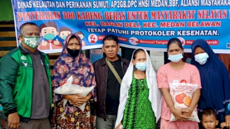 Medan, RedaksiDaerah.com - Sebagai bentuk kepedulian terhadap sesama manusia melalui AP2GB, HNSI, BFF bersama Kepala Dinas (Kadis) Kelautan dan Perikanan Sumut menyerahkan bantuan 300 karung beras kepada masyarakat Nelayan Bagan Deli, Kelurahan Bagan Deli, Jum'at (18/12/20).