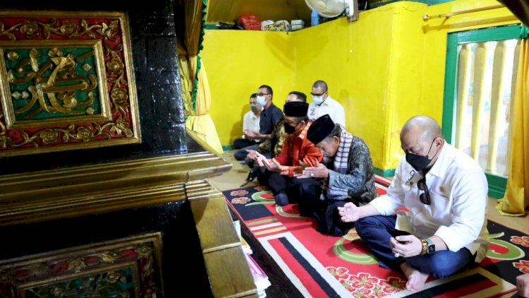 La Nyalla yang berziarah bersama Wagub Kalbar Ria Norsan memanjatkan doa di makam Sultan Syarif Abdurrahman didampingi juru kunci Makam Batu Layang, Syarif Umar Alkadrie.