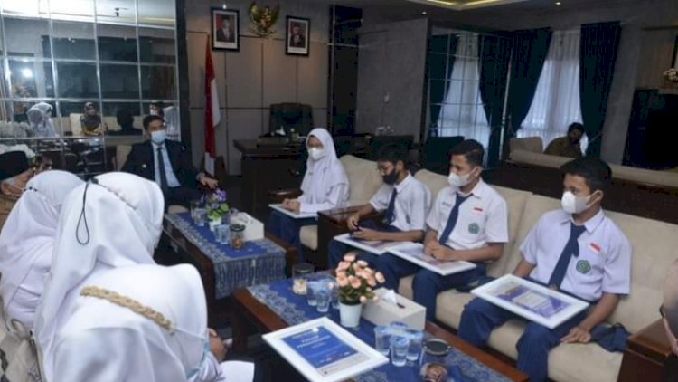 Wali Kota Sawahlunto., Deri Asta menyambut dan menyerahkan hadiah pada para pelajar tersebut bersama Wakil Wali Kota., Zohirin Sayuti dan Sekretaris Daerah (Sekda) Dr Ambun Kadri, MKM.