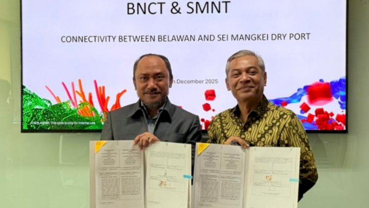 Medan, Redaksidaerah.com - PT Belawan New Container Terminal (BNCT) dan Sei Mangkei Dry Port (BUP – PT Sei Mangkei Nusantara Tiga) resmi menandatangani Nota Kesepahaman (Memorandum of Understanding/MoU) sebagai langkah strategis memperkuat sinergi dan optimalisasi layanan kepelabuhanan guna mendukung kelancaran arus logistik ekspor–impor di Sumatera Utara. Penandatanganan MoU tersebut dilaksanakan pada Kamis, 18 Desember 2025, bertempat di Kantor PT Belawan New Container Terminal (BNCT).