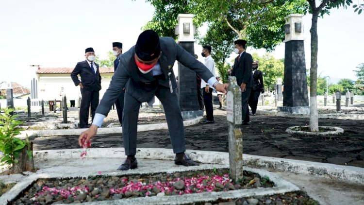 Bupati Haryanto mengajak semua yang hadir untuk mengenang sejenak jasa para pahlawan yang telah gugur dan kemudian dilanjutkan dengan peletakan karangan bunga.