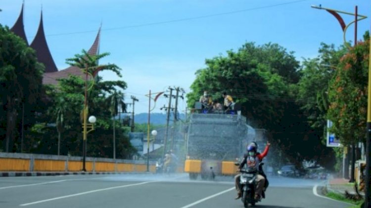 Padang |Sumbar| - Secara serentak, hari ini seluruh jalan diwilayah Sumatera Barat disemprotkan disinfektan oleh pihak Kepolisian, Selasa (31/03/2020).