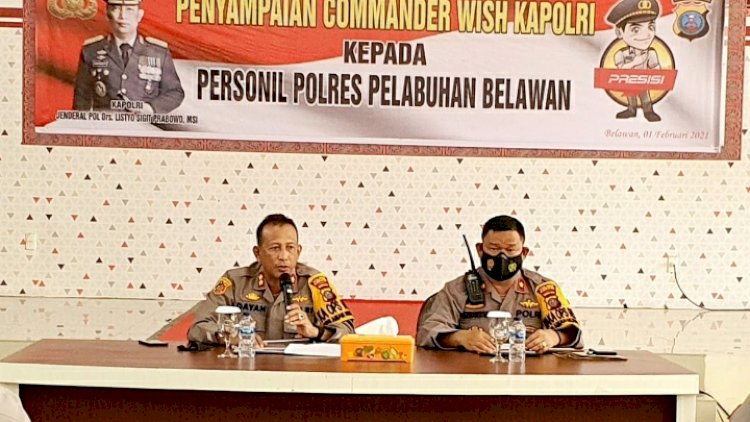 Kapolres Pelabuhan Belawan AKBP .DR.MHD.R.Dayan SH.MH.menyampaikan Commander Wish Kapolri kepada PJU-nya .Penyampaian Commander Wish Kapolri Senin (1/02/2021) pukul 09.30 Wib bertempat di Aula Wira Satya Polres Pelabuhan Belawan, Jalan Pelabuhan Raya I, Kelurahan Bagan Deli, Kecamatan Medan Belawan, Kota Medan ( Sumut). Acara yang dihadiri Waka Polres Pelabuhan Belawan, Kompol Irwansyah, para Kabag, Kapolsek , Kasat dan seluruh Perwira Polres dan Perwira Polsek.