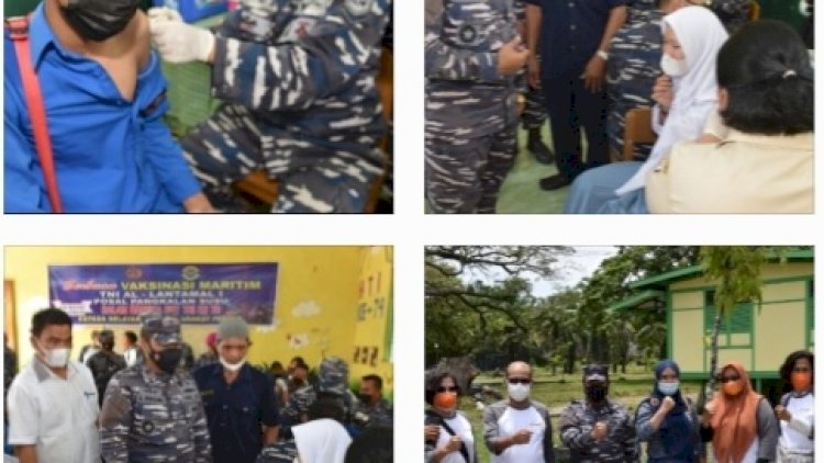 Dalam Rangka HUT TNI ke 76 Sebanyak 1000 pelajar dan Orang tua berhasil divaksin dosis Pertama dari Tim Vaksinasi TNI AL Lantamal I, Pelaksanaan vaksin dihalaman sekolah SMP/SMK Dharma Patra Pangkalan Susu Kabupaten Langkat Sumatera Utara, Sabtu (02/10/2021). Tim Vaksinasi TNI AL Lantamal I kembali melebarkan sayapnya untuk melaksanakan serbuan vaksinasi maritim kepada pelajar kabupaten Langkat Sumatera Utara, kegiatan ini merupakan bentuk perhatian TNI AL terhadap permintaan dari Kepala Sekolah SMP/SMK DP P.Susu agar segera mendapatkan vaksin, selama ini kami hanya bisa melihat di media Lantamal I melaksanakan serbuan Vaksin daerah Belawan, namun hari ini impian itu terkabulkan dengan kehadiran Tim Vaksinasi Serbuan Maritim TNI AL Lantamal I di sekolah kami, ungkapan terima kasih juga disampaikan kepada Danlantamal I yang telah hadir dan melaksanakan vaksinasi terhadap siswa/siswa sekolah SMP/SMK kami, tutur Kepala sekolah bapak Edi Saswono kepada pers yang hadir meliput kegiatan tersebut. Pelaksanaan serbuan vaksinasi juga ditinjau langsung Komandan Lantamal I Laksamana Pertama TNI Achmad Wibisono yang didampingi Bupati Langkat yang diwakili Kadis oendidikan Kabupaten Langkat, Wadanlantamal I, PJU dan Kasatker, Danyonif 8 Marinir dan Danposal Pangkalan Susu Letda Laut (E) Sunarno Sidadi untuk memastikan kegiatan vaksinasi berjalan lancar terhadap pelajar SMP/SMK DP Pangkalan Susu untuk siswa/siswi berumur 12-18 tahun, Kegiatan ini akan selalu digalakkan guna mendukung program pemerintah untuk mencapai target vaksinasi Covid-19 dosis ke-1 dan ke-2 sebanyak 70% dari jumlah penduduk Indonesia bisa tervaksin supaya dapat kekebalan komunal (Herd Immunity). Pungkas Danlantamal I kepada awak media. Dalam pelaksanaan vaksinasi tetap dilaksanakan sesuai prosedur kesehatan Covid-19 dimana masyarakat setelah selesai divaksin, dihimbau untuk tetap tinggal ditempat untuk menjalani observasi selama 30 menit guna mengetahui reaksi Kejadian Ikutan Pasca Imunisasi (KIPI) atau efek samping dari vaksin Covid-19 tersebut dengan tujuan apabila terjadi gejala yang tidak diinginkan akan dapat ditangani dengan cepat. Dan tetap menerapkan protokol kesehatan yang ketat dengan harus memakai masker, menjaga jarak dengan tidak bergerombol yang selalu dingatkan oleh anggota Babinpotmar, Yonmarhan I dan personel Pomal yang ikut membantu dalam mengatur peserta vaksinasi. Untuk mendukung pelaksanaan kegiatan vaksinasi disiapkan tenaga kesehatan sebagai vaksinator sebanyak 3 Tim, 1 Tim dari Dinas Kesehatan Lantamal I, 2 Tim dari RSAL Komangmakes.