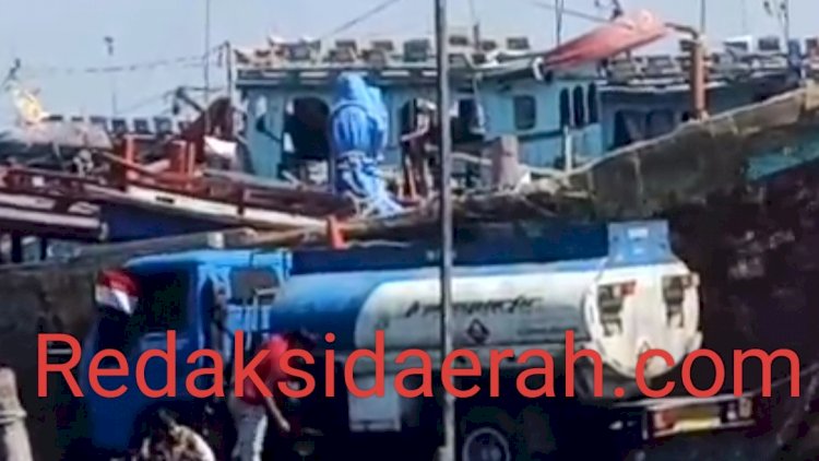 Tampak di lokasi gudang SU mobil tangki biru putih dengan plat polisi BK 8503 EB sedang mengisi di salah satu boat tangkap ikan yang bersandar di dermaga Gudang SU.