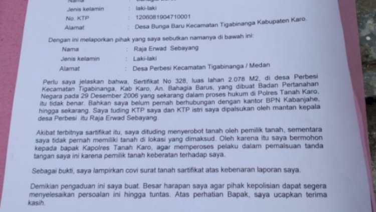 Padahal seumur hidup saya belum pernah berurusan dengan BPN, kenapa bisa terbit surat itu, oleh karena itu maka saya melaporkan pemegang Sertifikat Tanah atas nama Raja Edward Sebayang ke Mapolres Tanah Karo melalui surat peryataan saya ini, "ucapnya.