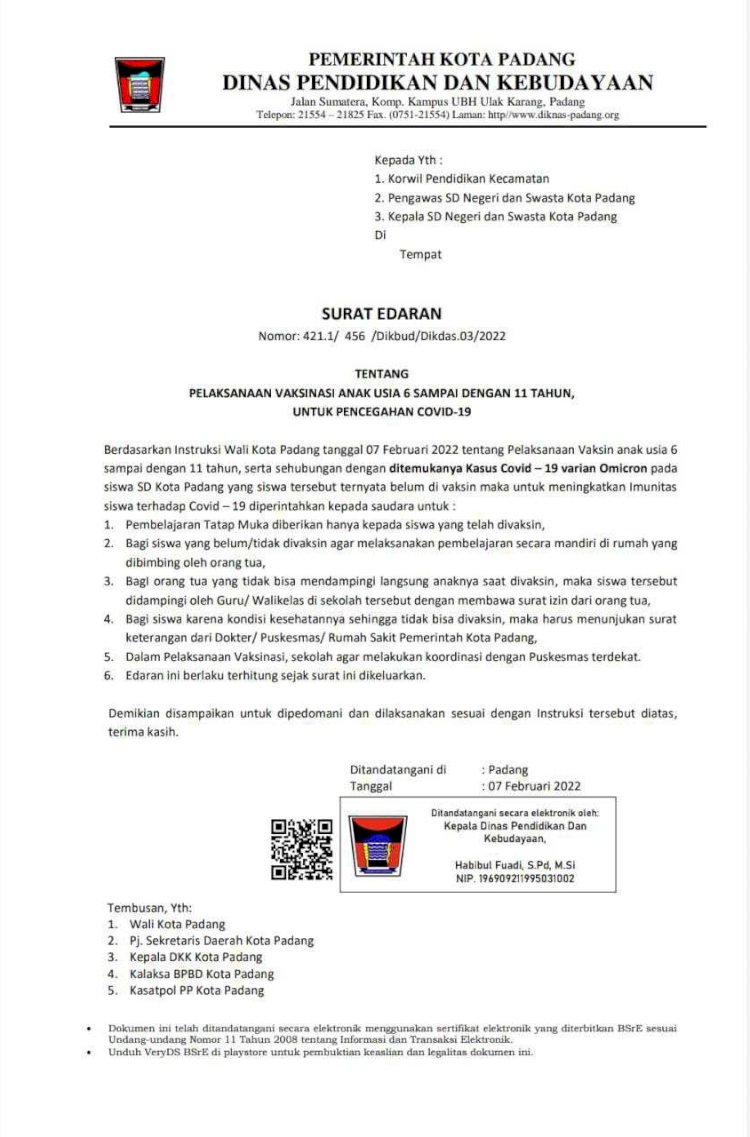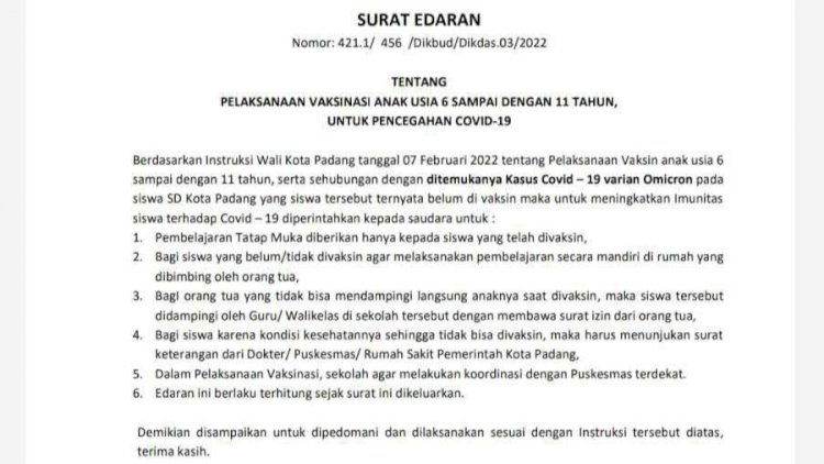 Dimana Surat Edaran Dinas Pendidikan Kota Padang yang dimaksud bernomor 421.1/456/DikbudDikdas.03/2022 tanggal 07 Februari 2022 tentang Pelaksanaan Vaksinasi Anak Usia 6 - 12 Tahun Untuk Pencegahan Covid-19 yang terdapat pada point ke 2 (dua) yaitu bagi siswa yang belum atau tidak divaksin agar melaksanakan pembelajaran secara mandiri dirumah yang dibimbing oleh orang tua.