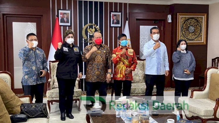 Jakarta, RedaksiDaerah.com - Panitia Natal Parlemen (MPR/DPR/DPD RI) yang dipimpin Willy Midel Yoseph selaku Ketua Anggota Komisi VII DPR RI sekaligus Ketua Panitia Natal dan Inosentius Samsul selaku Kepala Badan Legislasi DPR RI sekaligus Ketua Persekutuan Doa Oikumene MPR/DPR/DPD RI melakukan audiensi dengan La Nyalla Mattaliti dan Ketua MPR RI Bambang Soesatyo, di Kompleks Parlemen, Jakarta, Senin (18/01/21).
