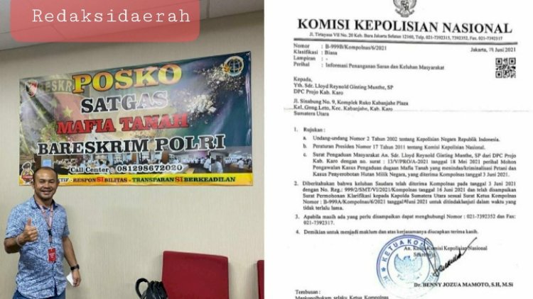 Surat Pengaduan Masyarakat (Dumas) Ketua DPC Pro Jokowi (Projo) Kabupaten Karo Lloyd Reynold Ginting Munthe, SP dengan nomor : 13/V/PRO/A-2021 tanggal 18 Mei 2021 perihal Mohon Pengawalan Kasus Pengaduan Dugaan Mafia Tanah yang menindas/kriminalisasi petani dan kasus Penyerobotan Hutan Milik Negara yang diterima Komisi Kepolisian Nasional per tanggal 3 Juni 2021 lalu, akhirnya mendapat jawaban.