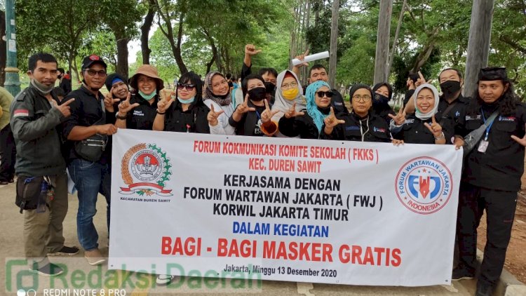Jakarta, RedaksiDaerah.com - Dalam Rangka menggalakan Protokol Kesehatan di tengah masyarakat dan mensosialisasikan penggunaan masker, Forum Komunikasi Komite Sekolah (FKKS) berkolaborasi bersama Forum Wartawan Jakarta (FWJ) Korwil Jakarta Timur melakukan kegiatan bagi-bagi masker untuk pengunjung BKT Duren Sawit Jakarta Timur, DKI Jakarta, Minggu (13/12/20).