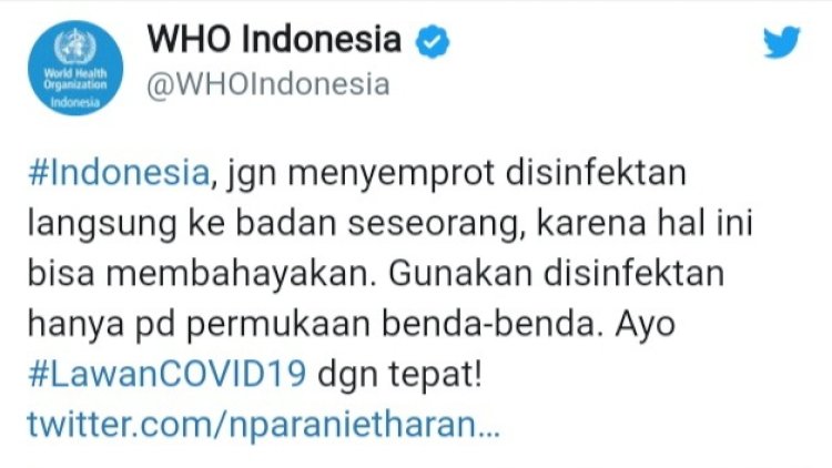 "Menyemprot bahan-bahan kimia seperti itu dapat membahayakan jika terkena pakaian atau selaput lendir, contohnya mata dan mulut," tulis cuitan dari akun resmi WHO Indonesia di Twitter WHO, Minggu (29/03/2020).
