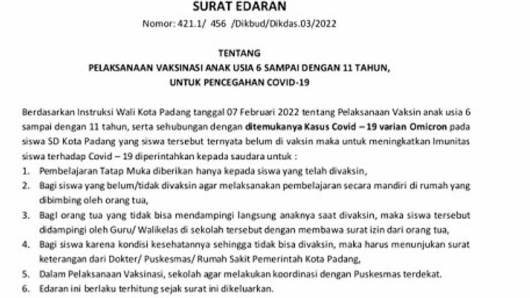 Pada tempat terpisah, Kepala Dinas Pendidikan Kota Padang., Habibul Fuadi mengatakan, keluarnya Surat Edaran tersebut karena mulai ditemukannya beberapa siswa SD di Kota Padang yang tak vaksin kena virus Covid-19.