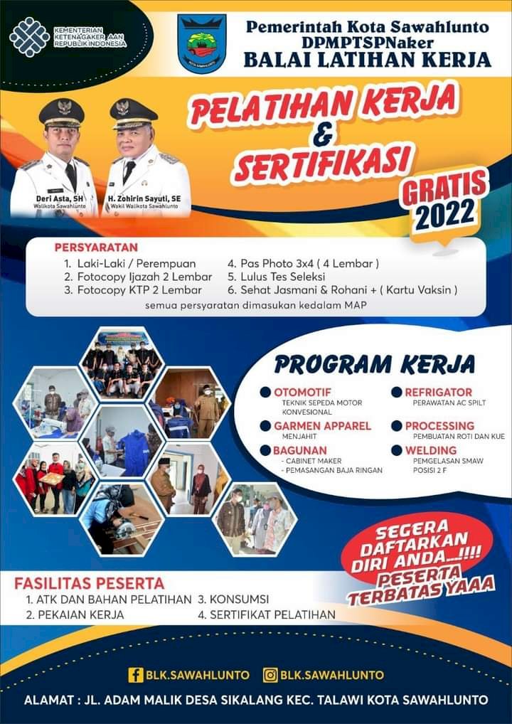 Sawahlunto, RedaksiDaerah.com - Pemko Sawahlunto membuka enam jenis pelatihan kerja secara gratis bagi generasi muda di Kota Sawahtunto, Sumatera Barat, Kamis (20/01/22).