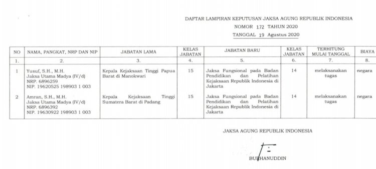 Jaksa Agung Republik Indonesia Dr ST Burhanuddin mencopot 2 (dua) Kepala Kejaksaan Tinggi (Kajati), Rabu (19/08/20).