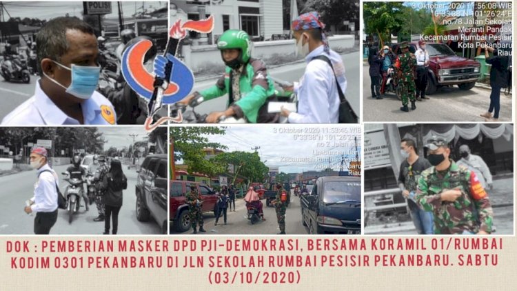 Pemberian masker dilakukan didepan Koramil 01/Rumbai Kodim 0301 Pekanbaru, tepatnya Jl Sekolah Rumbai Pesisir yang dilakukan oleh Ismail Sarlata Ketua,Anhar Rosal Sekretaris, Nurhayati Bendahara, DZ Fredy Zega Ketua OKK, Jaka Marhaen, SH Ketua Advokasi dan Supriyanti Anggota Humas DPD PJI-Demokrasi Provinsi Riau, dua Personil Koramil 01/Rumbai Serka Januarzal Babinsa Lembahasari, Andre Cahyadi Babinsa Lembah Damai, M.Darus Islami (Mak Etek) Humas dan Rinaldi Anggota DPD PUMA Nusantara Pekanbaru.