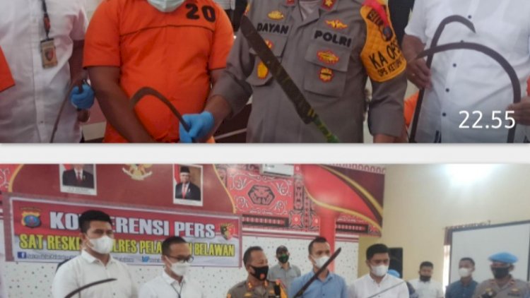 " Kapolres Pelabuhan Belawan, AKBP. Dayan memaparkan kasus penganiayaan mengakibatkan orang meninggal dunia dengan tersangka Agus Tamrih ( 36), Buhari Saputra ( 25). Adapun barang bukti 1 parang, 1 buah Kayu, 1 bongkahan kayu, 1 potong kemeja berlumuran darah.,1 potong jaket berlumuran darah,.