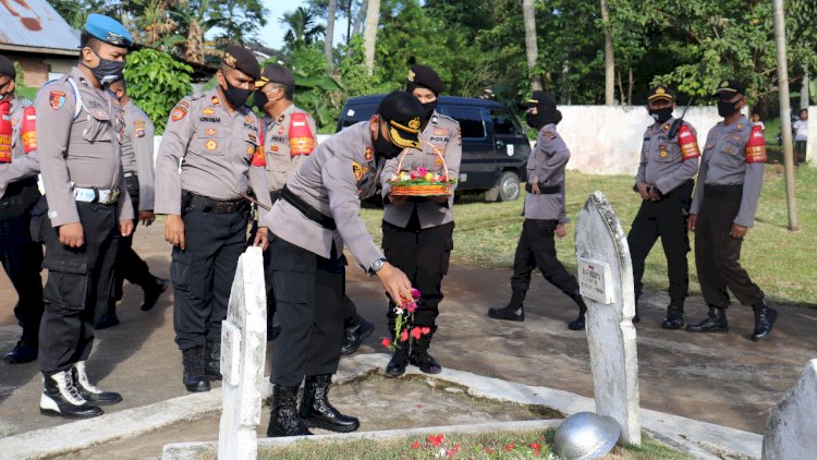 Tanah Datar |Sumbar| - Memperingati Hari Bhayangkara ke 74, Polres Tanah Datar menggelar upacara ziarah di Taman Makam Pahlawan (TMP) Bahagia Batusangkar, Sumatera Barat, Senin (28/06/20).