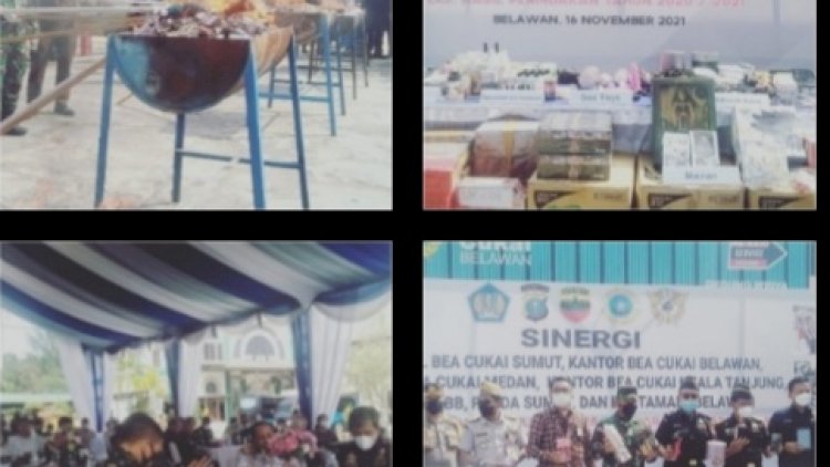 Kepala Kantor Wilayah Direktorat Jenderal Bea dan Cukai (DJ BC )Sumatera Utara Par Jiya Pimpin Pemusnahan Barang Milik Negara Hasil Penindakan Kepabeanan Negara dengan nilai seluruh barang yang dimusnahkan tersebut kurang lebih Rp 3.57 miliyar .Sedangkan potensi kerugian negara yang dapat ditimbulkan karena tidak dipungut cukai,bea masuk dan pajak dalam rangka import sekitar Rp3.45 milyar .Kakanwil BC Sumut Par Jiya juga mengatakan ,hingga saat ini masih terdapat kemungkinan penyeludupan seperti impor barang ilegal ,narkotika ,peredaran rokok ilegal tanpa cukai dan minuman keras ilegal ,sehingga BC diwilayah Sumatera Utara bersinergi dengan TN ,Polri,Pemerintah Daerah serta masyarakat untuk melakukannpenertiban secara bersinabungan.Pemusnahan tersebut dilaksanakan di halaman kantor Bea dan Cukai Belawan Selasa(16/11/2021) pukul 13.30 wib. Dalam pemusnahan turut dihadiri para undangan pejabat Sumatera Utara TNI ,Polri dan Pemerintah ,KP2LN, Kepala kantor Bea Cukai Belawan Tri Utomo, dan Kepala KualabTanjung ,Kapolres Pelabuhan Belawan AKBP .Faisal Komandan Pomal,Danden Pom Medan dan Subden Pom Belawan, Sat Pol PP Propinsi Sumut,Karantina Tumbuhan dan hewan,Lantamal I Belawan ,Kejaksaan ,serta undangan lainnya. Seperti disebutkan awak media ini pemusnahan yang berlangsung dilakukan dengan cara dibakar ,menghancurkan dan dipotong secara gerenda.Sehingga seluruh barang ilegal itu tidak dapat dipergunakan lagi atau tidak punya nilai jual.Par Jiya juga mengatakan, Barang Milik Negara (BMN) itu nerupakan hasil penindakan petugas BC bersinergi dengn TNI dan Polri pada tahun 2020 hingga 2021 dan telah mendapat persetujuan pemusnahan dari Direktorat Jenderal Kekayaan Negara.Adapun jenis barang yang dimusnahkan antara lain berupa barang import ,yaitu 667 bungkus pakain,tas dan sepatu barang bekas,5228 kemasan obat -obatan ,alat kesehatan ,kosmetik ,pakaian 2.400 bungkus barang elektronik,sparepats berikut aksesoris ,5580 bungkus barang olahan makanan dan minuman kadaluarsa diantaranya susu bubuk, permen,minyak goreng dan coklat.Disebutkan barang itu kena cukai yang turut dimusnahkan rokok tanpa cukai 3425497 batang dan minuman keras ilegal sebanyak 1.111.33 liter. Menurut pihak Bea dan Cukai Sumatara Utara nilai jumlah seluruhnya yang dimusnahkan sekitar Rp. 3.57 milyar.
