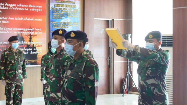 Komandan Pangkalan Utama TNI AL II (Danlantamal II) Laksamana Pertama TNI Hargianto, SE, MM, M.Si (Han) bertindak sebagai Inspektur Upacara pada Serah Terima Jabatan (Sertijab) Asisten Personel (Aspers) dari Kolonel Laut (KH) Arwani kepada Letkol Laut (KH) Abdul Majid di Lobby Markas Komando (Mako) Lantamal II Padang jalan Bukit Peti Peti Teluk Bayur Padang, Sumatera Barat, Rabu (24/03/21).