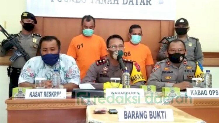 Kapolres Tanah Datar AKBP Rokhmad Hari Purnomo, SIK, MSI melalui Wakapolres Kompol Eridal, SH dan didampingi oleh Kabag OPS Ischak menyampaikan, pelaku beraksi berjumlah empat orang, namun yang dua orang lain nya masih dalam pencarian. Dua orang pelaku yang berhasil di tangkap berinisial IN (47) beralamat Mandalajati Bandung dan SF (53), Subang Jawa Barat, Jum'at (24/07/20).