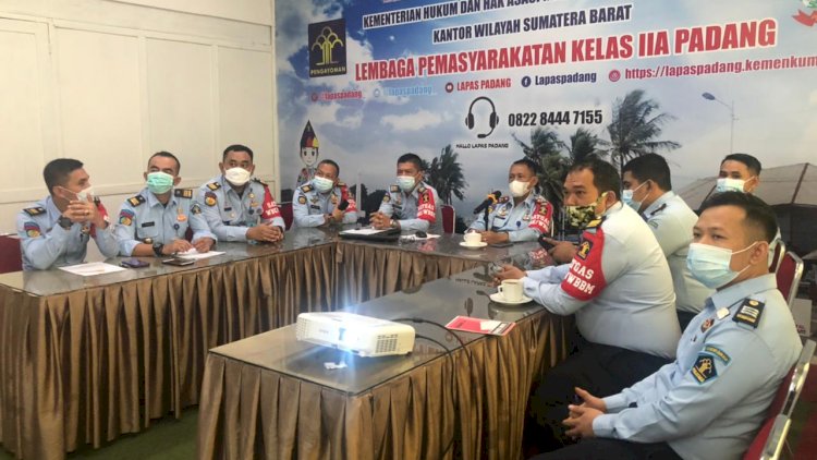 SUMBAR|PADANG– Kepala Lembaga Pemasyarakatan (Lapas) Kelas IIA Padang Era Wiharto didampingi oleh jajaran Pengelola Keuangan, KPLP, Binadik dan Giatja ikuti kegiatan Evaluasi Penyerapan Anggaran sekaligus Pengarahan oleh Kepala Divisi Kantor Wilayah Kementerian Hukum dan Hak Asasi Manusia Sumatera Barat Muhammad Ali Syah Banna melalui aplikasi zoom meeting di ruang rapat lapas pada Rabu (9/6) pagi. Kegiatan ini juga diikuti oleh seluruh Unit Pelaksana Teknis Pemasyarakatan (UPT Pas) se- Sumbar secara virtual.