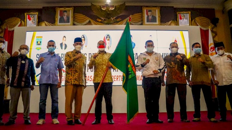 Gubernur Mahyeldi bersama Wakil Gubernur Audy Joinaldy secara resmi melepas Kontingen Sumatera Barat untuk mengikuti Pekan Olahraga Nasional XX Papua di Auditorium Kompleks Gubernur, Padang (27/9/21).