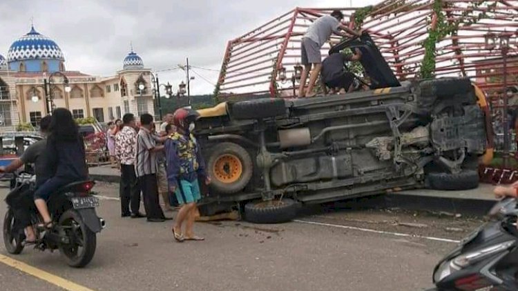 Kejadian kecelakaan Mobil Dinas Patroli terbalik di depan Tugu Gempa Kota Gunungsitoli Yang di setir oleh salah seorang anggota polisi An. BARKAH ALGHORI (BA).