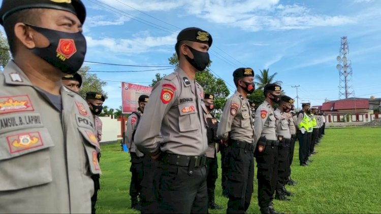 Morotai |Malut| - Polres Pulau Morotai Laksanakan Apel Gelar Pasukan Bina Waspada Kie Raha 2020 dalam rangka Pencegahan dan penangkalan aliran sesat dan anti ideologi pancasila guna menwujudkan kamtibmas yang aman dan kondusif wilayah Polda Malut di Lapangan Mako Polres Morotai, Senin (16/11/20).
