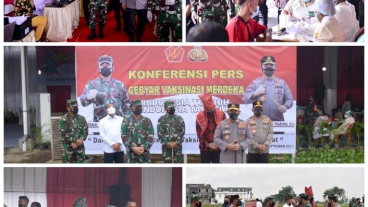 Panglima TNI dan KAPOLRI meninjau langsung pelaksanaan Gebyar Vaksinasi Merdeka dan Pemberian Sembako terhadap warga Pasar Induk Lau Cih Medan Tuntungan Sumatera Utara yang di dampingi oleh Gubernur Sumatera Utara, Pangkogabwilhan I, Pangdam I BB, Kapolda, Danlantamal I beserta Unsur Forkompimda Sumut dan Walikota Medan, Jumat (17/09/2021). Warga Pasar Induk Lau Cih Medan Tuntungan Sumatera Utara sangat senang dan antusias melaksanakan Vaksin yang diinisiasi oleh pemerintah kota Medan, pelaksanaan vaksinasi massal dan pembagian sembako hari ini sangat special karena ditinjau langsung Panglima TNI dan Kapolri beserta seluruh unsur Forkopimda Sumut dan walikota Medan sebagai tuan rumah dan sehari sebelumnya warga Sumatera Utara juga kedatangan tamu paling istimewa yaitu bapak Presiden Joko Widodo yang juga meninjau langsung pelaksanaan Vaksinasi secara door to door, diharapkan dengan kegiatan vaksinasi massal ini semakin meningkatkan pencapaian target program pemerintah untuk dapat memberikan vaksinasi Covid-19 dosis ke-1 dan ke-2 sebanyak 70% jumlah penduduk Indonesia bisa tervaksin supaya dapat kekebalan komunal (Herd Immunity) dari virus Covid-19 serta dapat mewujudkan slogan NKRI "INDONESIA TUMBUH INDONESIA TANGGUH" dalam menghadapi situasi Pandemi Covid-19. Selesai Melaksanakan kegiatan Gebyar Vaksinasi Merdeka dan Pemberian Sembako kepada Masyarakat Pasar Induk Lau Cih Tuntungan Medan, Rombongan Panglima TNI dan Kapolri bergerak menuju Lanud Soewondo untuk kembali ke Jakarta. Untuk mendukung pelaksanaan kegiatan vaksinasi massal di pasar induk tersebut disiapkan tenaga kesehatan sebagai vaksinator dari TNI AL yang menurunkan Tim Nakes dari Diskes Lantamal I yang bergabung dengan Nakes dari unsur TNI POLRI lainnya.