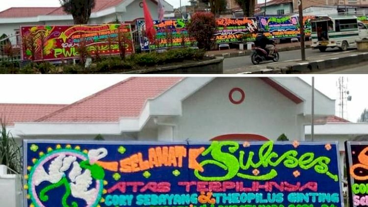 Karangan bunga ucapan selamat tersebut ditujukan kepada calon Bupati dan Wakil Bupati Kabupaten Karo, Cory S., Sebayang - Theopilus Ginting yang memperoleh suara terbanyak di Pilkada Karo 2020.