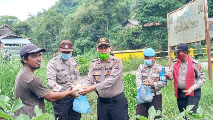 Ketika kami hampiri, ternyata Kapolsek bersama beberapa personel tengah membagikan nasi bungkus buat warga yang tengah upahan diladang-ladang masyarakat sekitar.