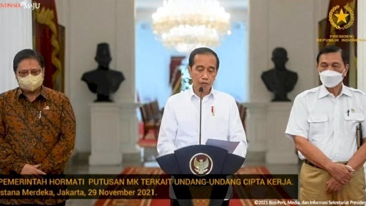 Kepala Negara menyebutkan bahwa dirinya telah memerintahkan jajarannya untuk segera menindaklanjuti dan melakukan perbaikan terkait putusan tersebut. Presiden menambahkan, seluruh peraturan pelaksanaan UU Cipta Kerja yang ada saat ini masih tetap berlaku.