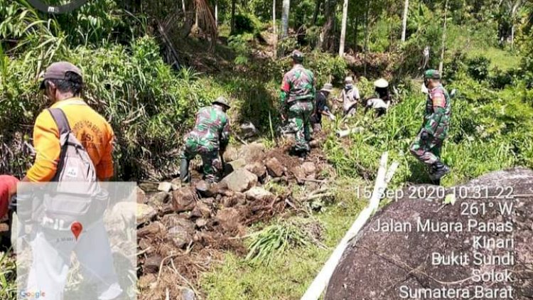 Solok |Sumbar| - Personel Koramil 08/Bukit Sundi Kodim 0309/Solok, yang dipimpin Bintara Tinggi Tata Usaha Urusan Dalam (Bati Tuud) Pelda Sugeng Riyadi melaksanakan kerja bakti bersama masyarakat Kelompok Keswadayaan Masyarakat (KKM) dalam rangka pembuatan galian pipa air atau yang lebih dikenal dengan sebutan Penyediaan Air Minum dan Sanitasi Berbasis Masyarakat (Pamsimas) di Jorong Pamujan, Nagari Kinari, Kecamatan Bukit Sundi, Kabupaten Solok, Sumatera Barat, Selasa (15/09/20).