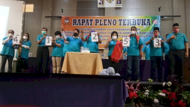 Karo |Sumut| - Pada hari ini Komisi Pemilihan Umum Daerah (KPUD) Kabupaten Karo melaksanakan pengundian nomor urut pasangan calon (paslon) Bupati dan Wakil Bupati Karo sekaligus penandatanganan deklarasi kampanye damai dan pakta integritas pada Pilkada Karo di Aula Hotel Sinabung Berastagi, Kamis (24/09/20).
