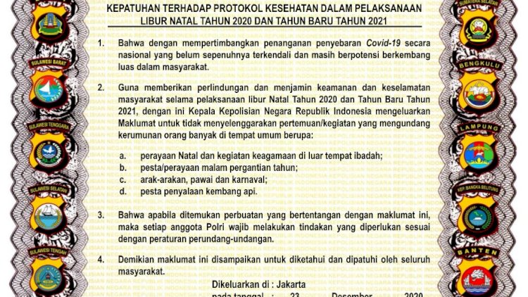 Sementara itu, isi maklumat yang dikeluarkan Kapolri tentang penerapan protokol kesehatan Perayaan Natal 2020 dan Tahun Baru 2021 yakni :