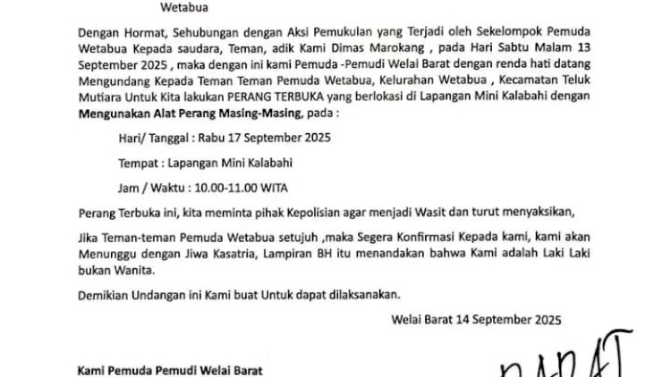 Alor, 15 September 2025, RedaksiDaerah.Com – Sejumlah pemuda Kelurahan Welai Barat mengirimkan surat undangan *“perang terbuka”* kepada Pemuda Kelurahan Wetabua sebagai respons atas aksi pemukulan dan penganiayaan oleh sekelompok pemuda Wetabua pada Sabtu malam, 13 September 2025. Surat ini menyerukan pertemuan di Lapangan Mini Kalabahi pada Rabu, 17 September 2025, dengan menggunakan alat perang masing-masing.