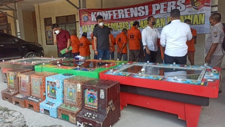 Polres Pelabuhan Belawan berhasil mengungkap praktek perjudian jenis tembak ikan. Hal tersebut dijelaskan Kapolres Pelabuhan Belawan AKBP Faisal Rahmat H.S., SIK., SH., MH., melalui Kasat Reskrim dalam konferensi pers yang dilaksanakan Jumat (15/10) sore. Kasat Reskrim AKP I KAdek H.C., SH., SIK., MH.,dalam pemaparannya didampingi KBO Sat Reskrim Iptu Arifin Purba, SH, Kanit Reskrim Polsek Medan Labuhan Iptu Andi Rahmadsyah, SH, Kanit I Sat Reskrim Ipda Erikson Siahaan, SH., MH dan Panit Unit 1 Sat Reskrim Ipda Elga Elite Raga Satria, S.Tr.K. Dalam Pemaparannya Kasat reskrim menjelaskan pihaknya berhasl melakukan penangkapan terhadap 7 orang pelaku perjudian dalam penggrebekan yang dilakukan pada Kamis (14/10) di Desa Manunggal Kec. Labuhan Deli, dari ketujuh TSK yang ditangkap 6 diantaranya merupakan pemain dan 1 orang sebagai penjaga atau penukar koin. “Saat penggrebekan kami menemukan 6 pemain dan 1 penjaga di lokasi perjudian dan berhasil mengamankan mesin judi tembak ikan, 3 unit HP dan uang tunai Rp. 350.000,-“ Ungkap Kasat Reskrim. “Penangkapan terhadap para pelaku perjudian tersebut merupakan hasil penyelidikan atas informasi yang diterima dari warga yang kemudian dikembangkan dan dilakukan penggrebekan” lanjut Kasat Reskrim. “Seluruh pelaku baik pemain maupun penjaga saat ini sedang dalam proses penyidikan lebih lanjut, apabila berkas perkaranya telah lengkap akan segera kami limpahkan ke kejaksaan” Tutup Kasat Reskrim.