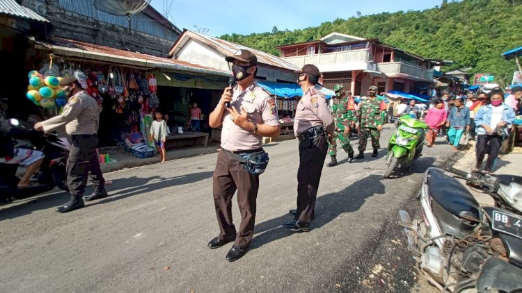 NIAS SELATAN |Sumut| - Guna memutus mata rantai penyebaran Virus Corona (Covid-19), Polres Nias Selatan melaksanakan sosialisasi protokol kesehatan dan pemakaian masker kepada masyarakat, di Pekan Helezalulu, Desa Bawootalua, Kecamatan Lahusa, Kabupaten Nias Selatan, Sumatera Utara, Sabtu (29/08/20).