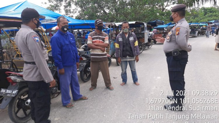 melaksanakan patroli di pasar Jum'at Kecamatan Tanah Putih Tanjung Melawan dan keliling memberikan himbauan tentang penggunaan masker ada mematuhi protokol 5 M dan pesan kamtibmas kepada pedagang dan pengunjung pasar Jum'at (02/07/2021) pukul 09.30 wib Petugas melaksanakan AIPDA IFANANTO dan BRIPKA SHOBIRIN