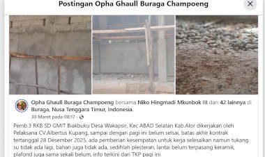 Sebelumnya diketahui bahwa akun facebook Opha Gaul Buraga telah memosting hal tersendatnya pembangunan RKB dimaksud, "Pemb.3 RKB SD GMIT Biakbuku Desa Wakapsir, Kec ABAD Selatan Kab.Alor dikerjakan oleh Pelaksana CV.Albertus Kupang, sampai dengan pagi ini belum selsai, batas akhir kontrak tertanggal 28 Desember 2025," tulis Opha Gaul di postingannya pada tanggal 30/03/26 lalu, pukul 08:17 wita.