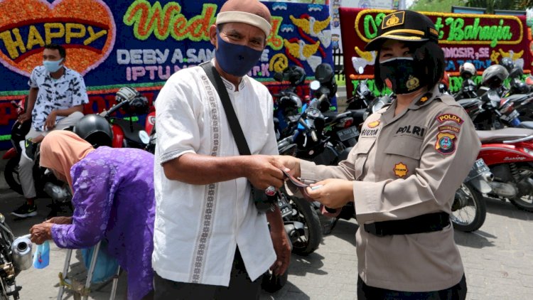 Selain patroli, personil Polwan Polda Sumut juga ikut bagikan masker sebagai upaya mencegah terjadinya klaster baru Covid-19 saat aksi demo tolak UU Cipta Kerja Omnibuslaw.