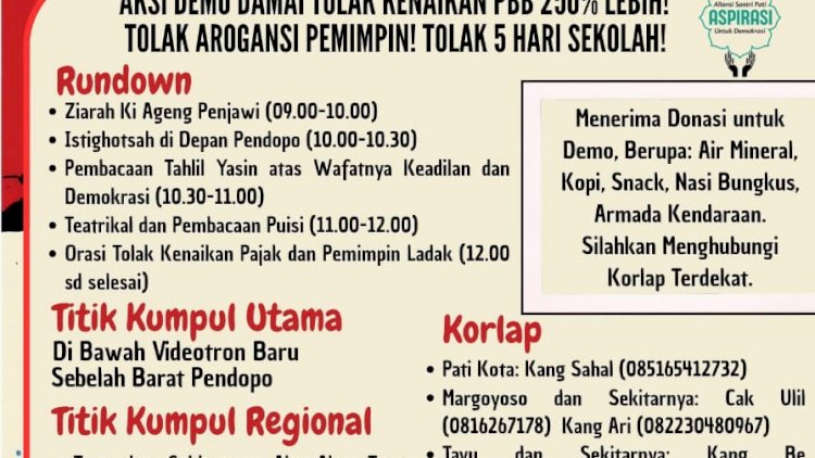 Menurut panitia, rangkaian kegiatan dimulai pukul 09.00 WIB dengan ziarah ke makam Ki Ageng Penjawi hingga pukul 10.00 WIB, dilanjutkan istighotsah di depan Pendopo pukul 10.00–10.30 WIB. Setelah itu, massa akan mengikuti pembacaan tahlil dan yasin sebagai simbol doa atas “wafatnya keadilan dan demokrasi” pada pukul 10.30–11.00 WIB. Agenda berlanjut dengan aksi teatrikal dan pembacaan puisi pukul 11.00–12.00 WIB, dan ditutup dengan orasi penolakan kebijakan pemerintah yang berlangsung hingga selesai.
