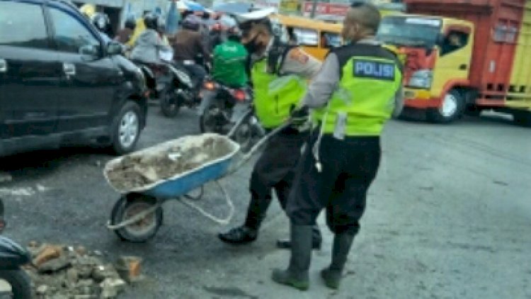 Keduanya terlihat dengan menggunakan gerobak sorong mengangkat pecahan batu-batu kecil untuk menimbun jalan yang rusak dan berlubang di persimpangan Jalan Sei Mencirim - Jalan Binjai Sunggal. Hal ini menjadi perhatian pengguna jalan yang melintas. Terlihat warga yang kebetulan melintas mengacungkan jempol sembari mengatakan mantap kepada Polantas.