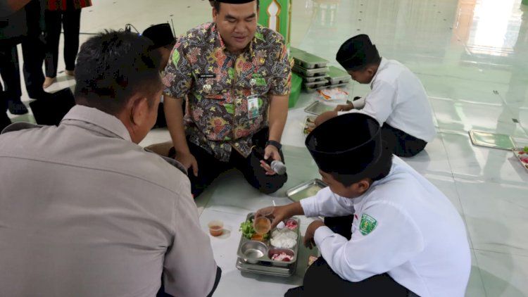 Di dalam aula, Bupati langsung mendekati beberapa siswa yang sedang menikmati menu makanan setelah berdoa bersama. Satu persatu dari mereka tampak lahap menikmati menu yang disajikan.