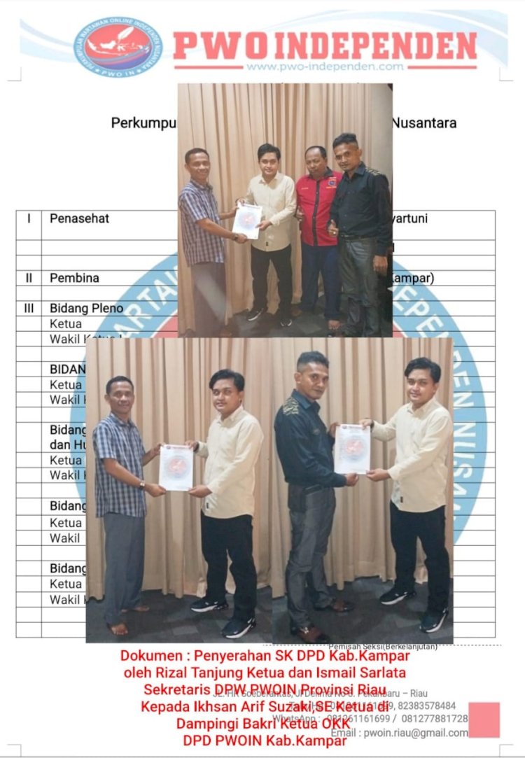 Adapun SK tersebut bernomor : SK-003/DPD-KamparVI/2020, yang diberikan untuk DPD PWOIN Kab Kampar yang langsung diberikan oleh Rizal Tanjung Ketua DPW PWOIN Provinsi Riau kepada Ikhsan Arif Suzaki, SE selaku Ketua didampingi Bakri Ketua OKK DPD PWOIN Kabupaten Kampar.