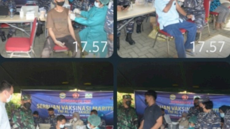 Belawan Tim Vaksinasi TNI AL Lantamal I Tuntaskan serbuan vaksinasi maritim Dosis 2 kepada warga Martubung sekitar PT Musimas Kawasan Industri Medan (KIM), vaksinasi dilaksanakan di Area Pabrik PT Musimas KIM Martubung Medan Labuhan Belawan, Selasa (16/11/2021).