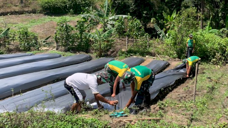 Personel Satgas bersama masyarakat bergotong royong membersihkan lahan serta membuat bedengan sebagai media tanam tomat agar tanaman dapat tumbuh optimal dan hasil panen meningkat. Kehadiran personel pos disambut antusias oleh warga yang turut bekerja bersama dengan penuh semangat kebersamaan.