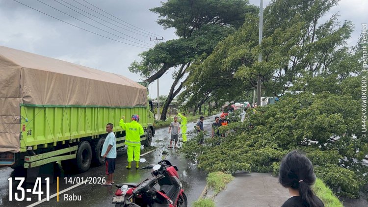 POLRESTA PATI - RedaksiDaerah.comPohon trembesi berukuran besar tumbang melintang di ruas Jalan Lingkar Pati–Juwana, turut Dukuh Gilis, Desa Sugiharjo, Kecamatan Pati, Rabu (14/1/2026) siang. Peristiwa yang terjadi sekitar pukul 13.10 WIB itu sempat mengganggu arus lalu lintas di jalur penghubung vital Pati–Juwana, namun berhasil ditangani cepat oleh aparat gabungan.