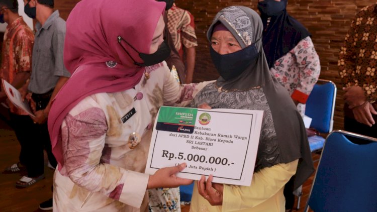 Penyerahan bantuan dilakukan Wakil Bupati Blora Tri Yuli Setyowati, ST, MM kepada 6 warga yang terdampak bencana kebakaran, Jumat (13/8/2021) di Lobi Center Point Setda Blora.