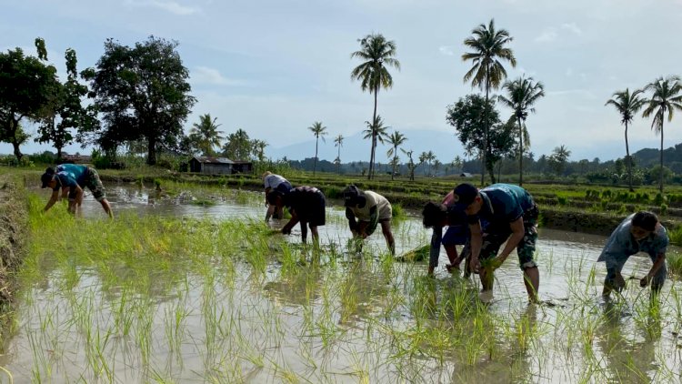 Kehadiran personel Pos Maubusa di tengah aktivitas pertanian warga disambut dengan antusias. Prajurit TNI dan masyarakat secara bersama-sama mengolah lahan dan menanam bibit padi, mencerminkan semangat kebersamaan serta kemanunggalan TNI dengan rakyat yang terus terjaga di wilayah tapal batas negara.